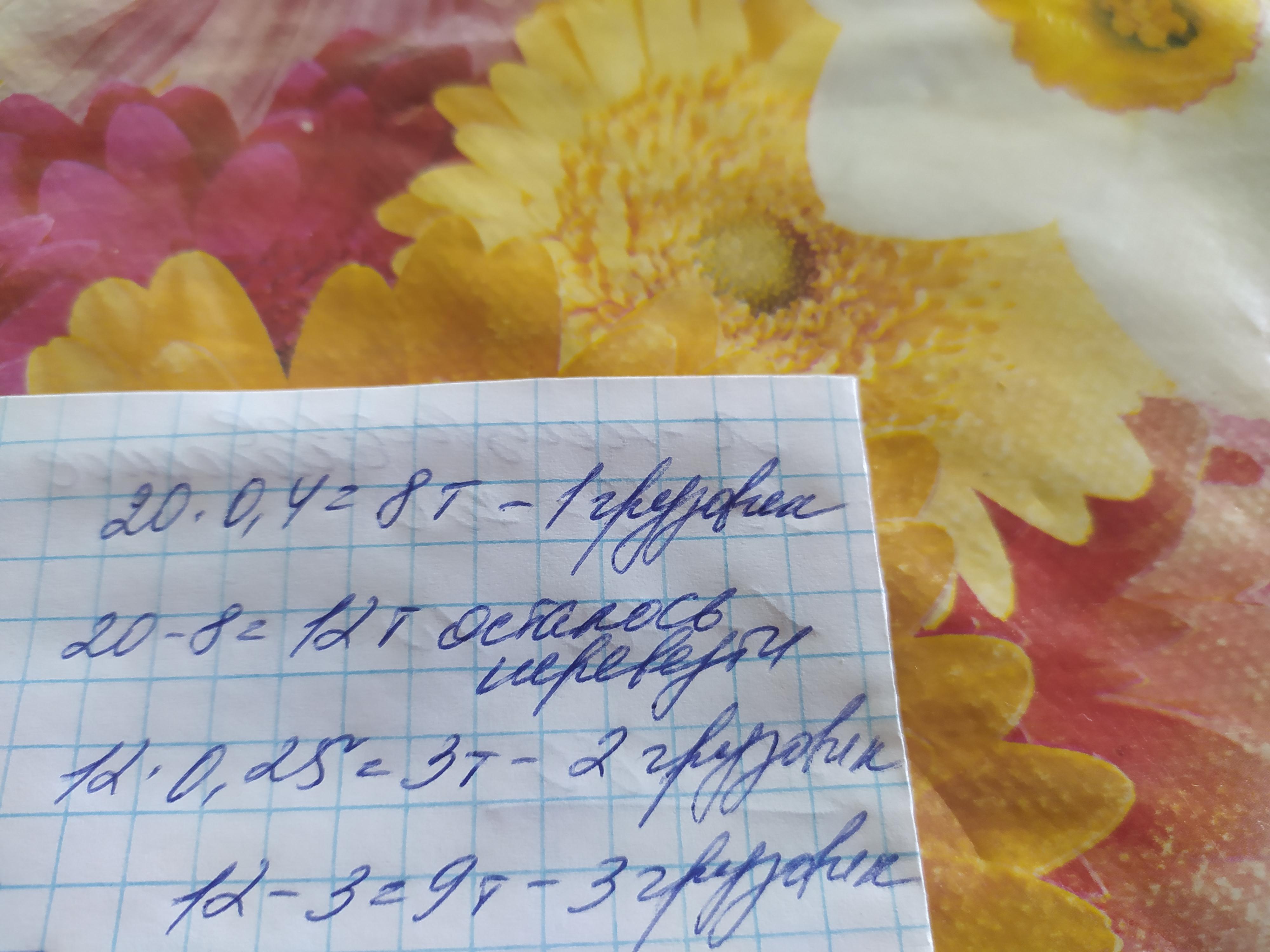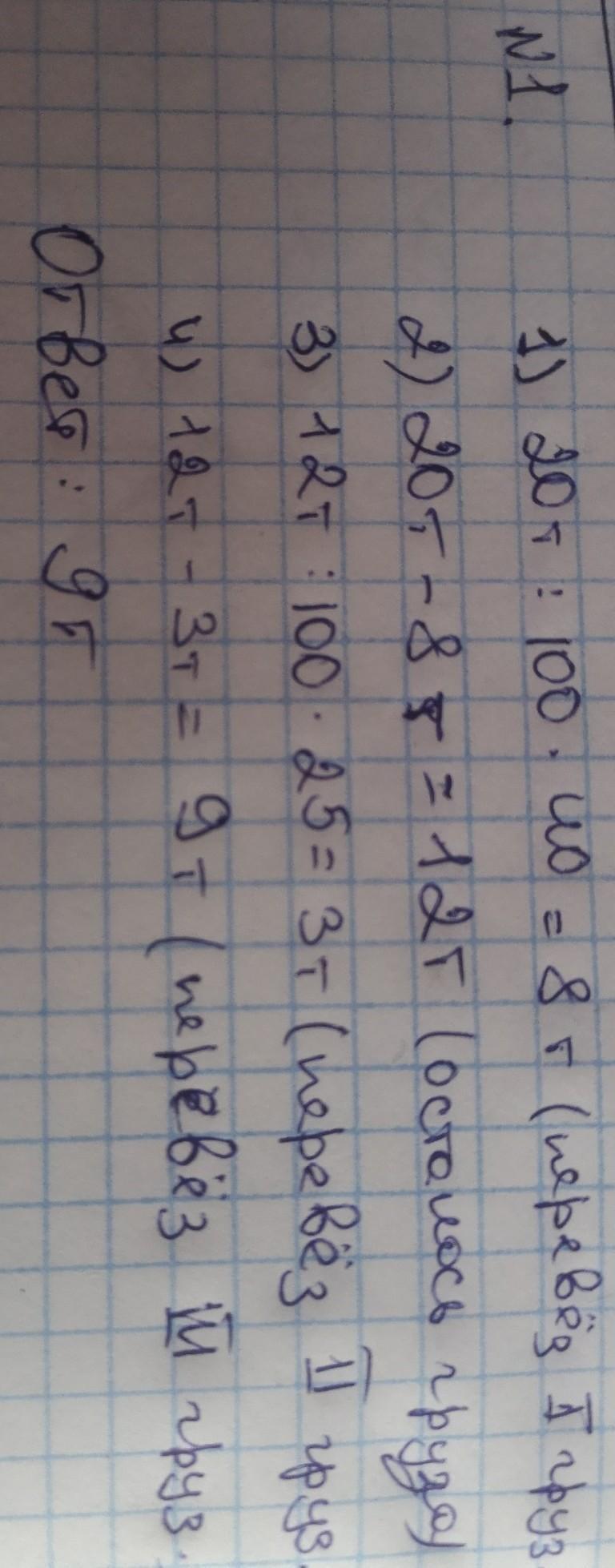 №1 Всего нужно было перевезти 20 тонн груза. Из них первый грузовик перевез 40%