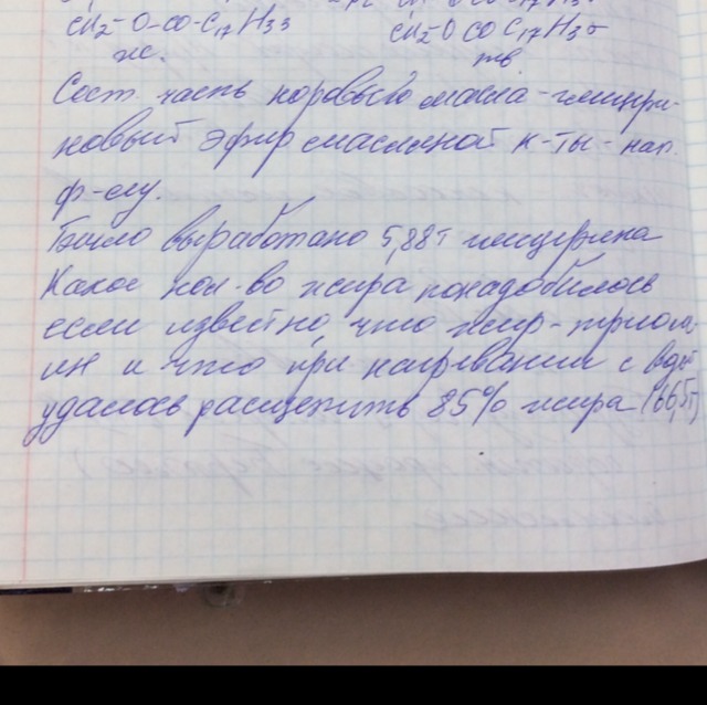 2. Было вырабатано 5,88 г глицерина. Какое количество жира понадобилось, если известно, что этот жир-триолеин, и что при нагрева ним с водой удалось расщемить 85% жира(66,5г)