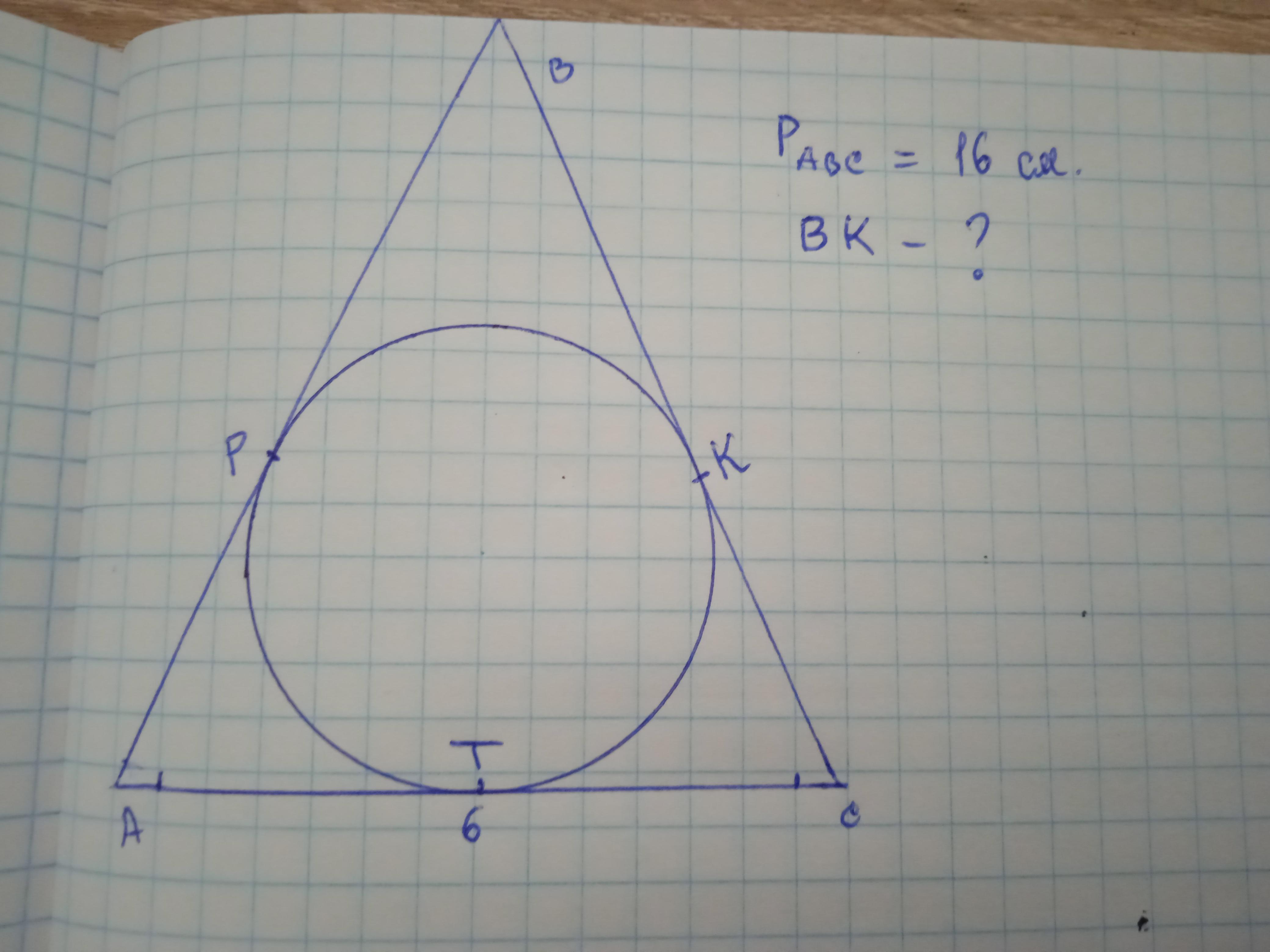 Коло, вписане в трикутник ABC, дотикається до сторони ВС у точці К. Знайдіть відрізок ВК, якщо AC = 6 см, а периметр трикутника ABC дорівнює 16 см. =