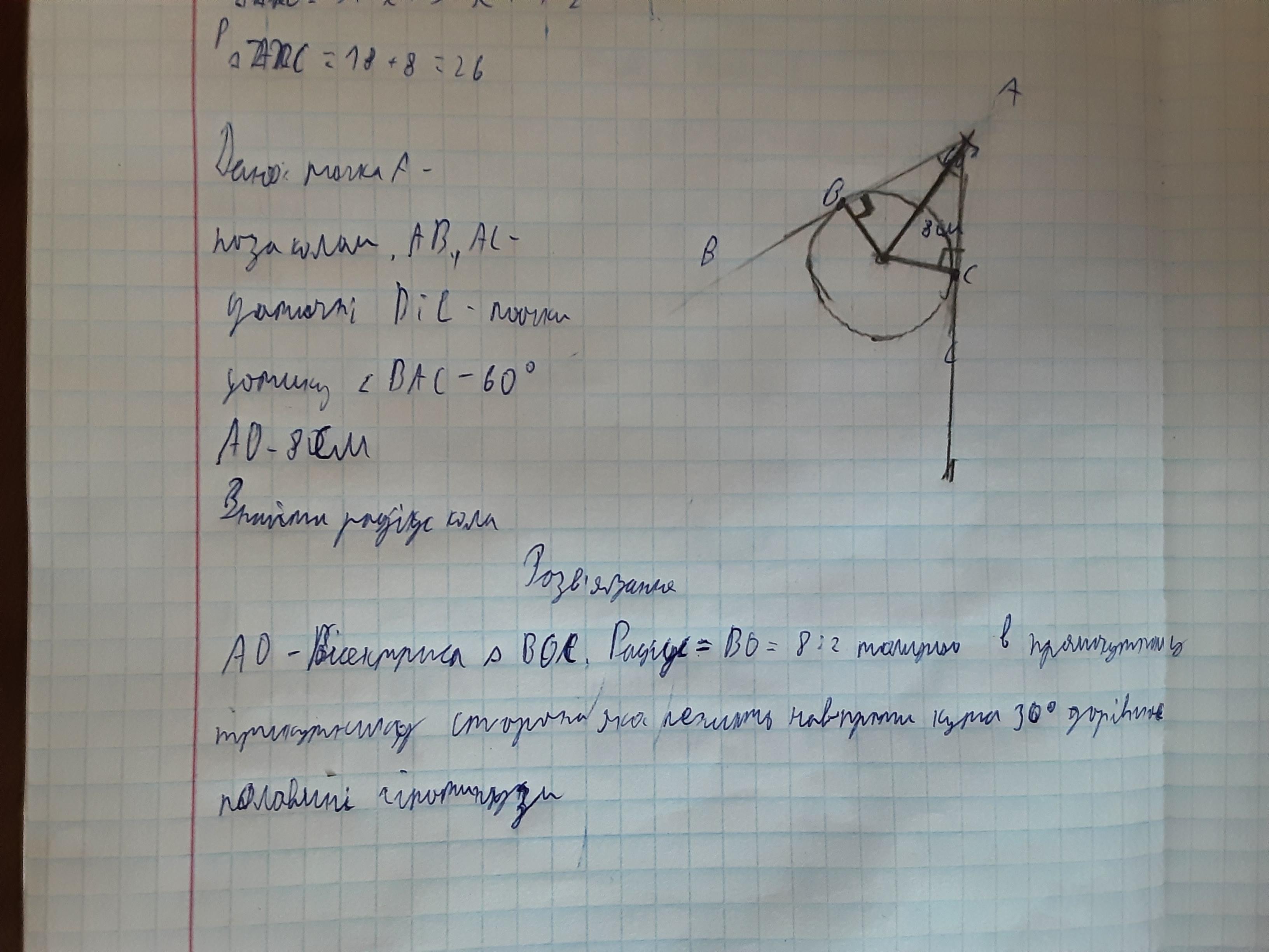 З точки А що лежить поза колом проведено до нього дві дотичні АВ і АС де В і С точки дотику кут ВАС=60° . Знайти радіус кола якщо відстань від точки А до центра кола 8см