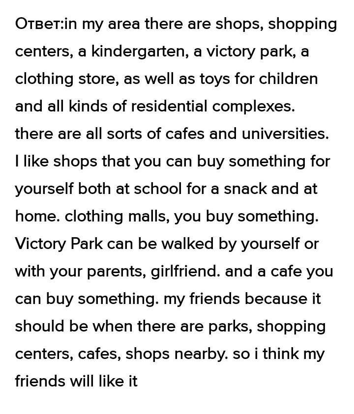 Ответ:in my area there are shops, shopping centers, a kindergarten, a victory park, a clothing store, as well as toys for children and all kinds of residential complexes. there are all sorts of cafes and universities. I like shops that you can buy something for yourself both at school for a snack and at home. clothing malls, you buy something. Victory Park can be walked by yourself or with your parents, girlfriend. and a cafe you can buy something. my friends because it should be when there are parks, shopping centers, cafes, shops nearby. so i think my friends will like it