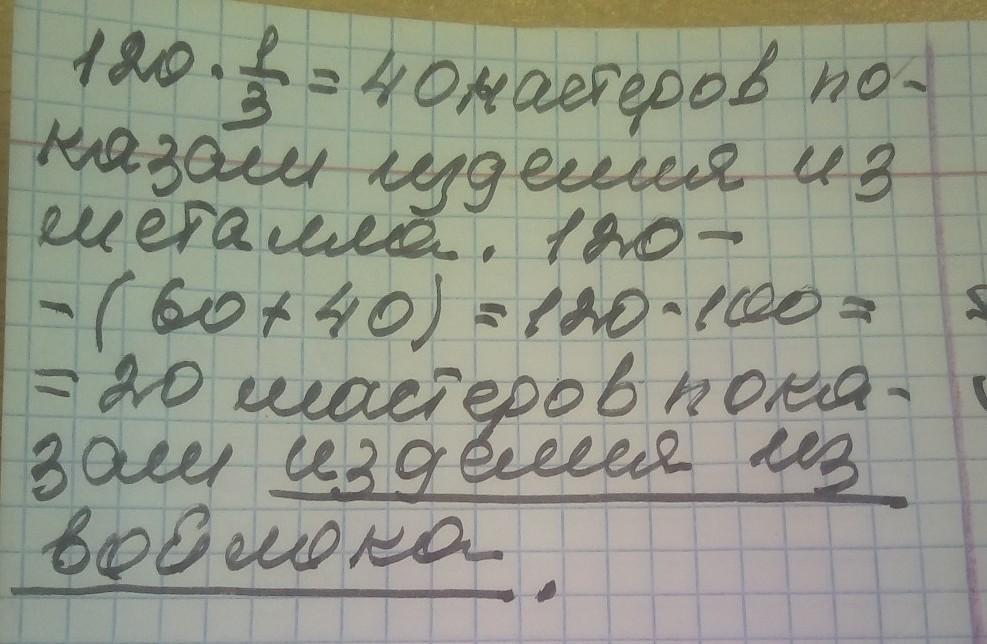 6) в секторе «Аул ремесленников» национально-культурного комплекса «Этноаул» своё мастерство показывали 120 мистен ров. 60 мастеров показали процесс изготовления изделий из дерева. Одна третья часть от общего количества мастеров - изделия из металла. Остальные представили изделия из вой лока. Сколько мастеров показали изделия из войлока? 2 пожалуйста сделаете условиях пж пж пж 100балов дам