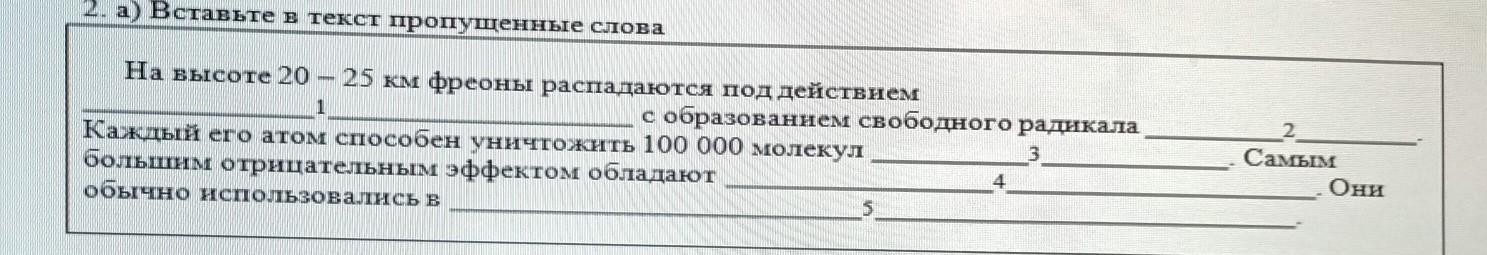 2. а) Вставьте в текст пропущенные слова На высоте 20 – 25 км фреоны распадаются под действием с образованием свободного радикала Каждый его атом способен уничтожить 100 000 молекул большим отрицательным эффектом обладают обычно использовались в 2 Самым Они