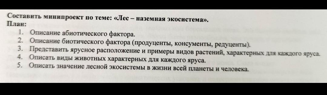 Экосистема леса, как и любая другая экосистема, также состоит из абиотических и биотических компонентов. Абиотические факторы включают элементы неживой природы, такие как воздух, вода, солнечный свет, почва и т.п. Биотические факторы включают живые организмы, которые принято разделять на три основные группы: продуценты, консументов и редуценты.