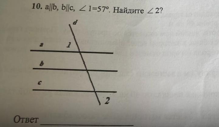 т.к. а параллельно b и b параллельно c, то a параллельно c. углы 1 и 2 накрест лежащие, относительно а и с. а значит, угол 1 равен углу 2.