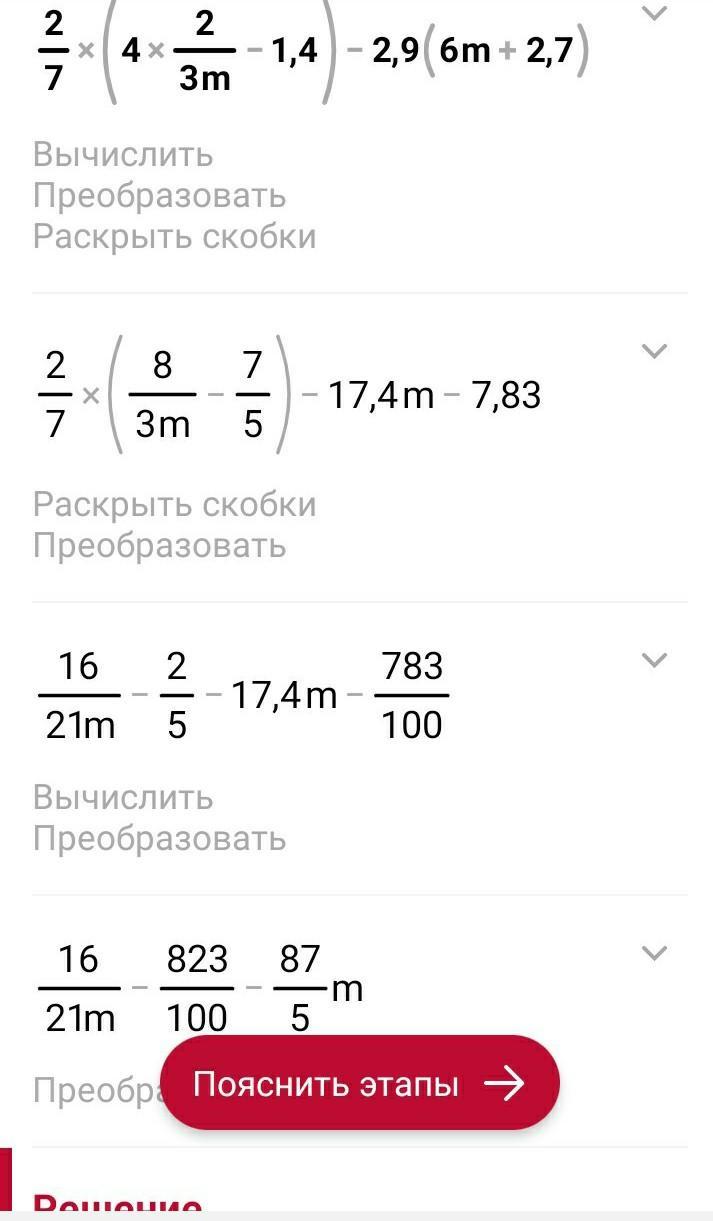 б)2/7(4 целых 2/3m-1,4)-2,9(6m+2,7)