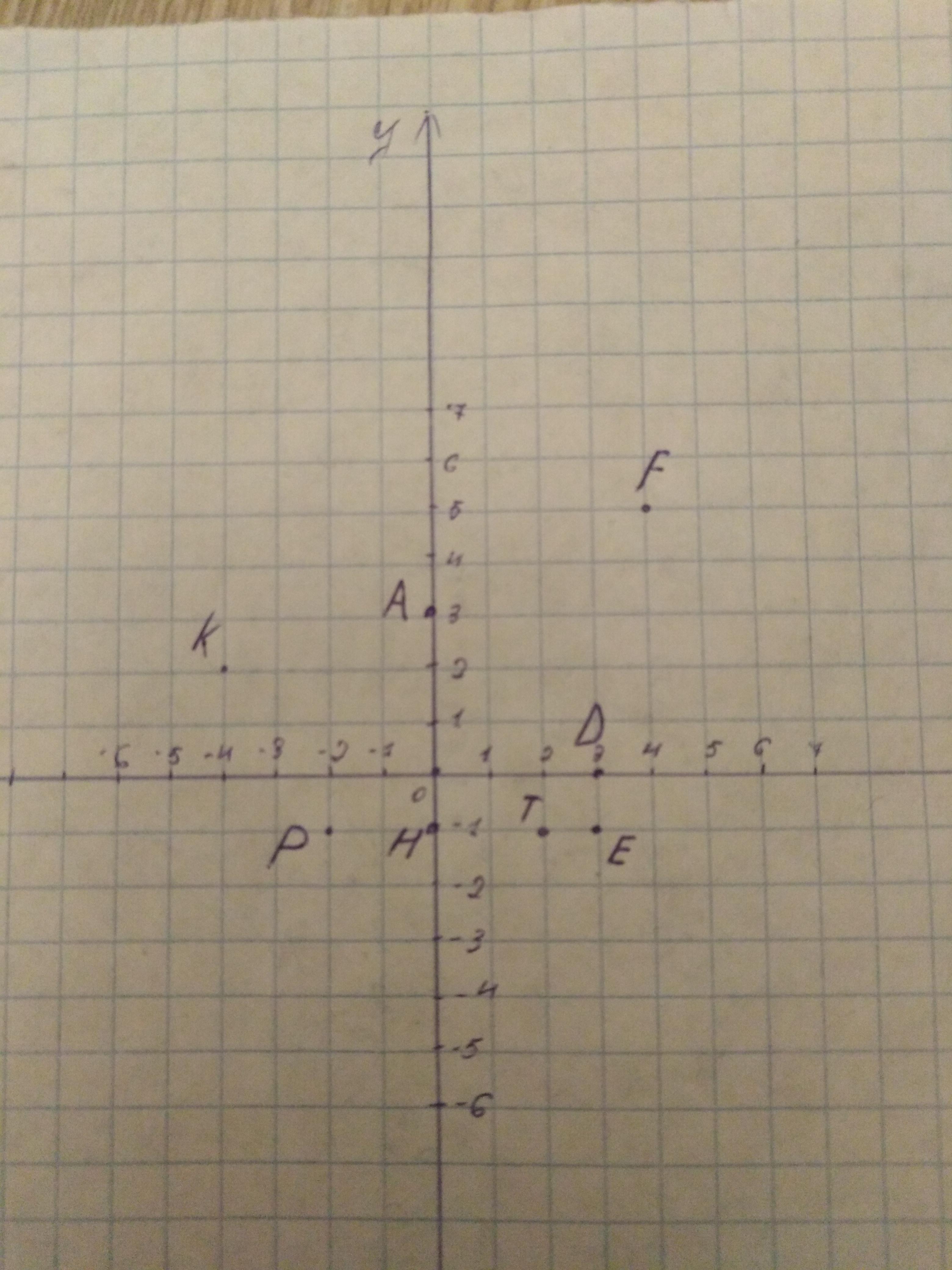 Позначте на координатній площині точки E (3;-1), F (4; 5), к(-4; 2), Р(-2;-1), Т (2; — 1), A (0; 3), D (3;0), н (0; -1).