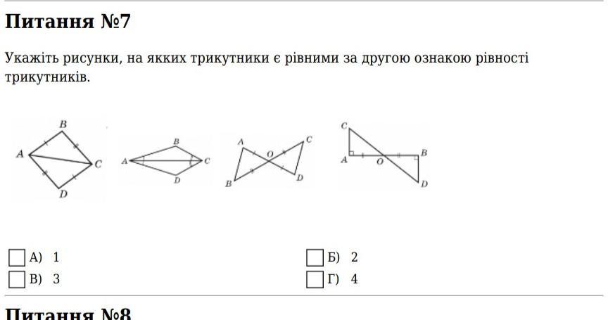 Укажіть рисунки, на якких трикутники є рівними за другою ознакою рівності трикутників.
