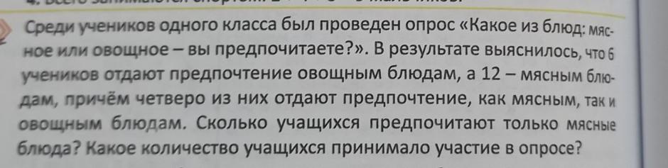Среди учеников одного класса был проведен опрос «Какое из блюд: Мяс- ное или овощное — вы предпочитаете?». В результате выяснилось, что б учеников отдают предпочтение овощным блюдам, а 12 – мясным блю- дам, причём четверо из них отдают предпочтение, как мясным, так и овощным блюдам. Сколько учащихся предпочитают только мясные блюда? Какое количество учащихся принимало участие в опросе?