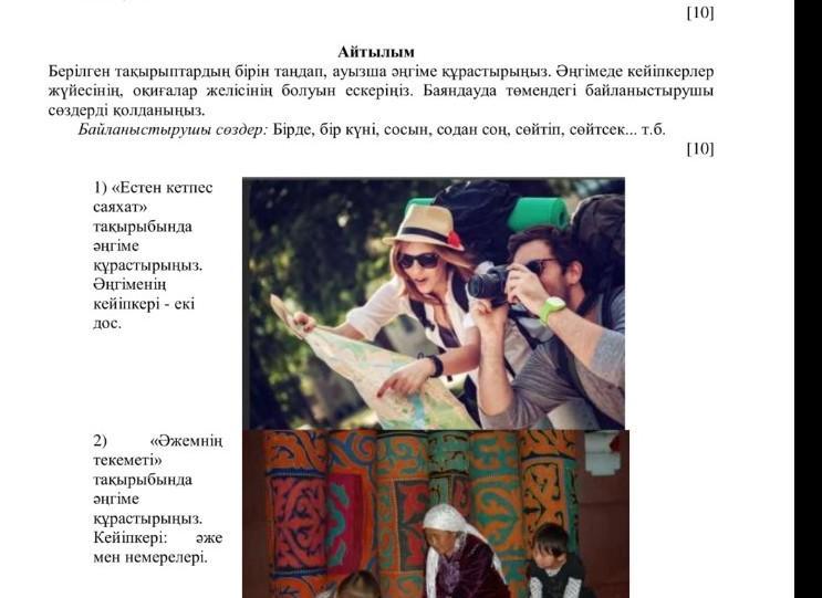 Берілген такырыптардын бiрiн тандап, ауызша әңгiме кұрастырыныз. Әңгімеде кейіпкерлер жуйесiнiн, окигалар желiсiнiн болуын ескерiнiз. Баяндауда темендегі байланыстырушы сөздерді колданыныз. Байланыстырушы сөздер: Бiрде, бiр кунi, сосын, содан сон, сейтiп, сөйтсек... т.б. [10] 1) «Естен кетпес саяхат» кұрастырыныз. Энгiменiң кейіпкері-екi дос. такырыбында Әңгiме 2) «Әжемнің текеметi> такырыбында Әңгiме курастырыныз. Кейiпкерi: әже мен немерелері.
