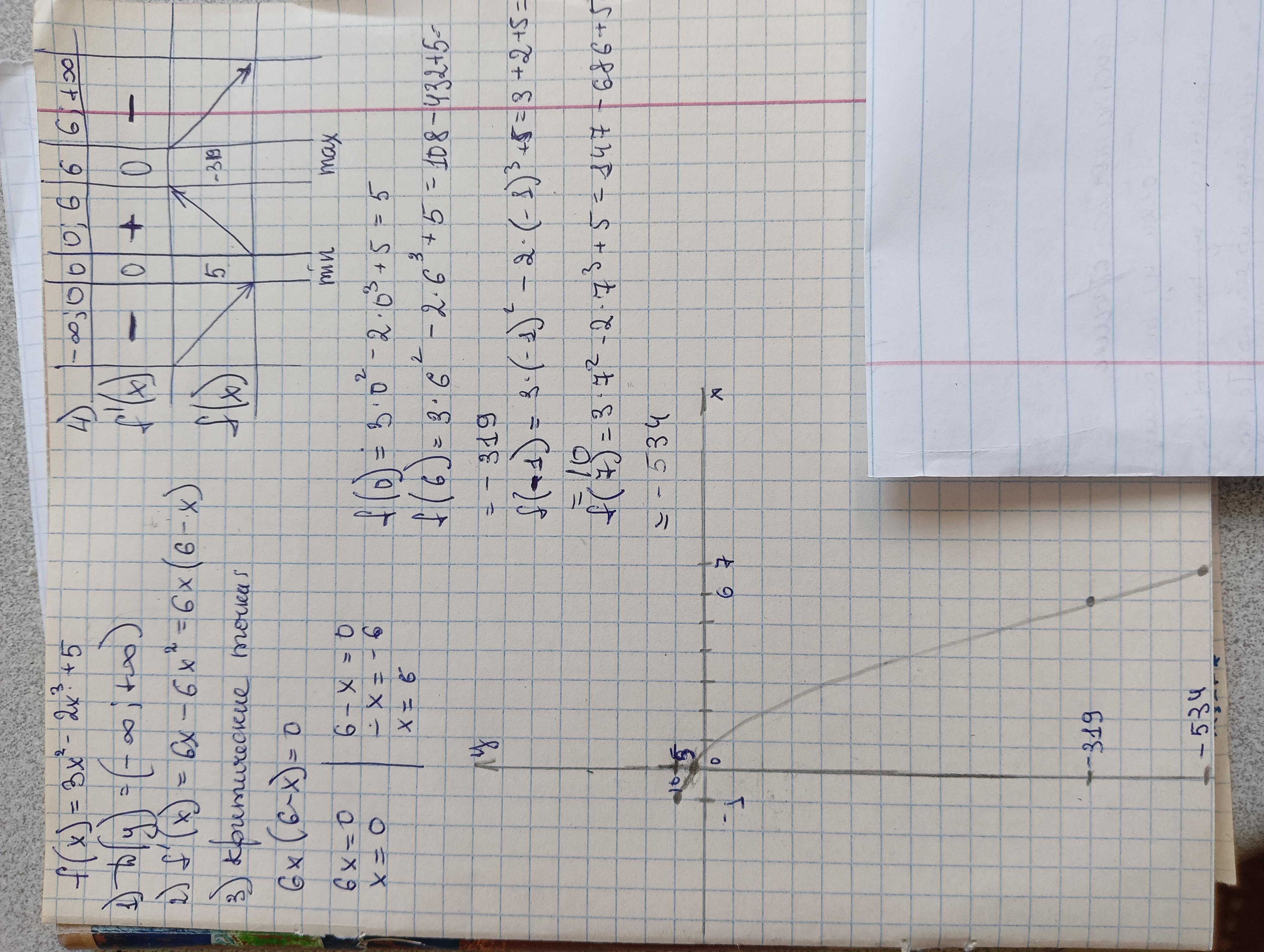 Помогите, пожалуйста f(x)=3x^2-2x^3+5 исследовать функцию с помощью производной и построить график.