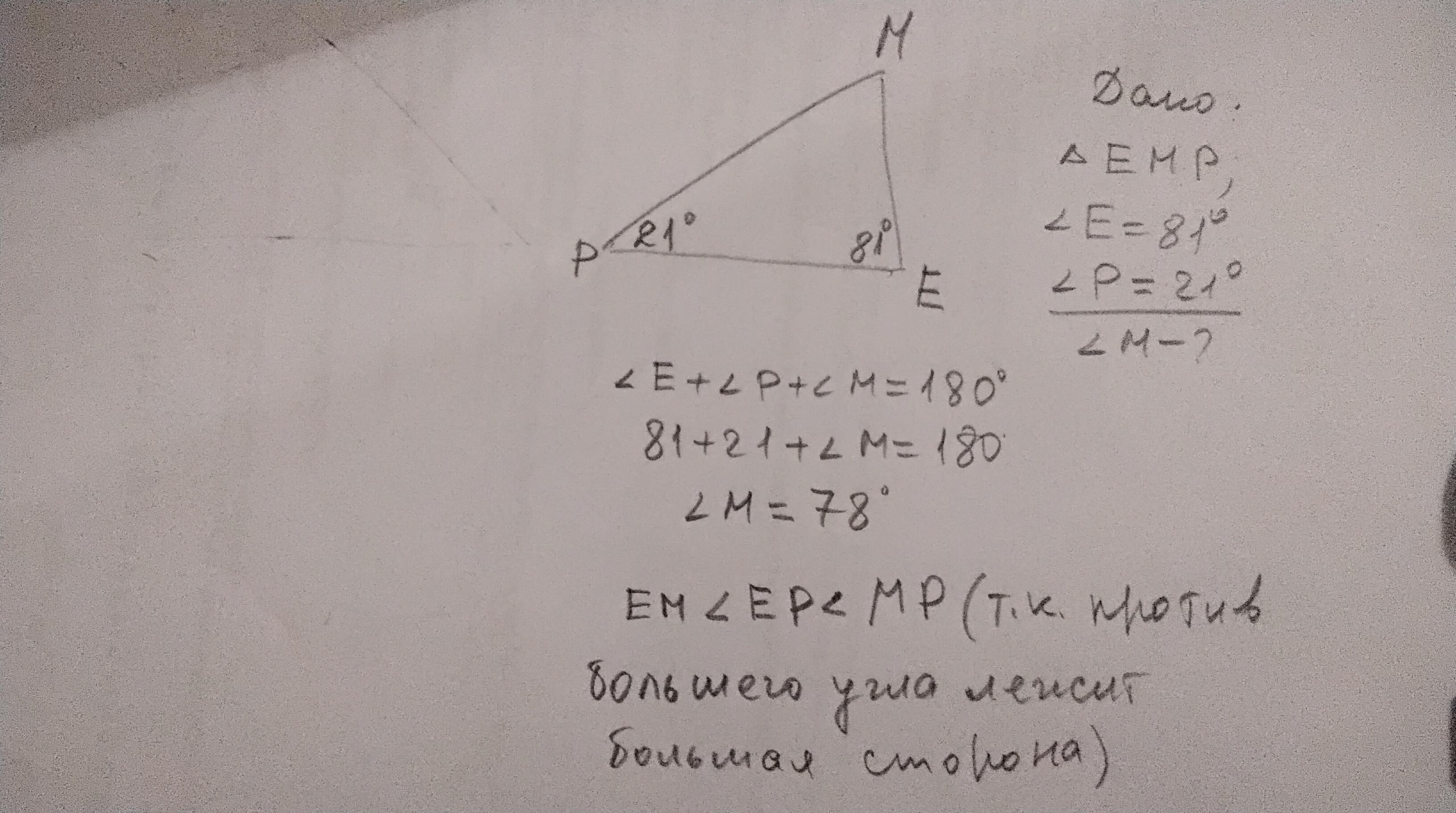 В треугольнике ЕМР ∠Е=81°, ∠Р=21°. Найдите ∠М.
