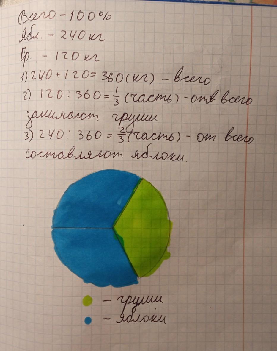 В перевозимого грузе 240 кг яблок и 120кг груш посторойте круговую диаграмму распределения массы яблок и груш в грузе