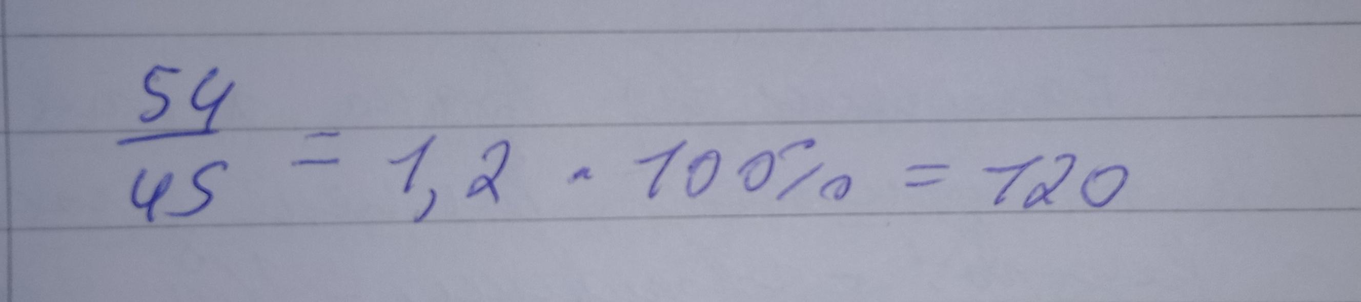 Чтобы найти число по проценту от него, нужно поделить известное число 54 на процент который оно составляет от числа. В данном случае это 45%. Получим 1,2 и умножим это число на 100%. Вот и всё, ответ найден.