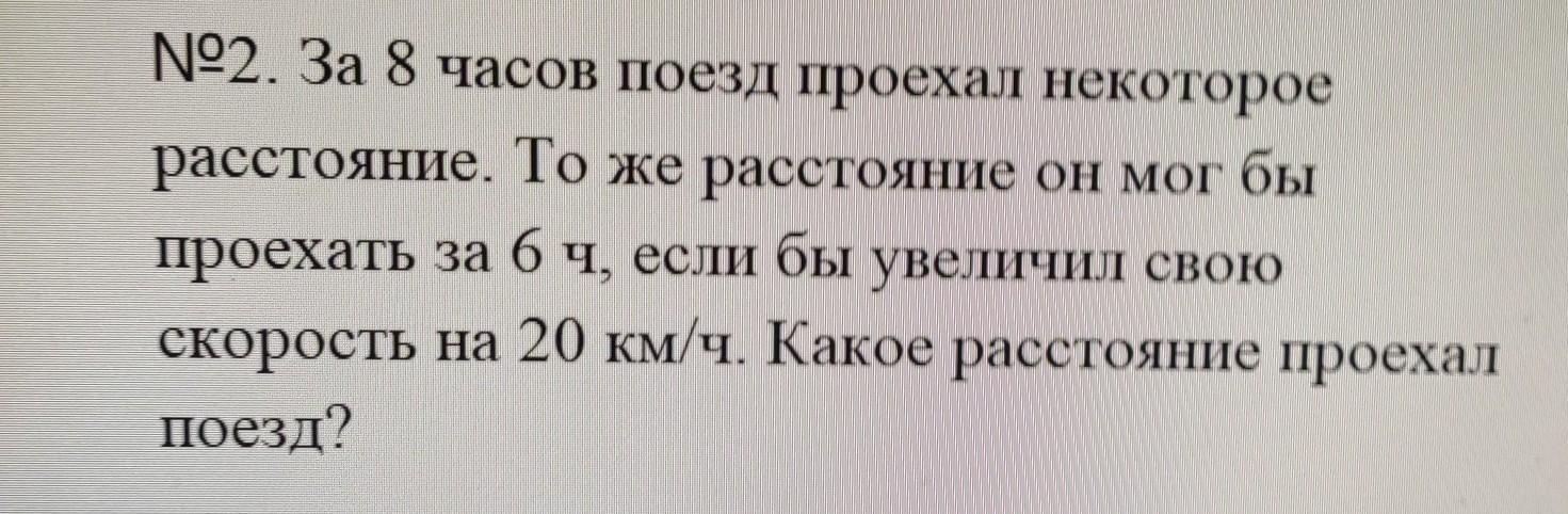 пусть х км/ч скорость поезда за 8 часов, тогда х+20км/ч за 6 часов. Составим и решим уравнение.