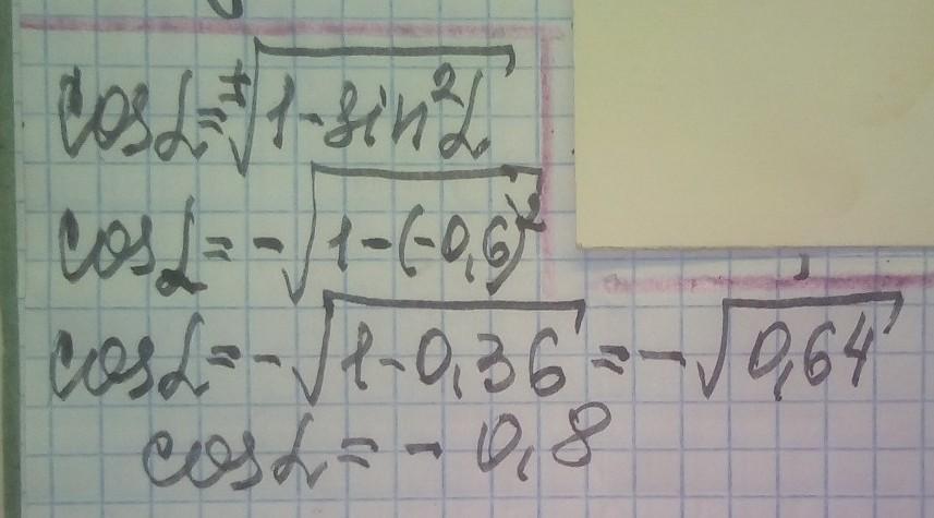 соs α=-√(1-sіn² α)=√(1-0.36)=-0.8