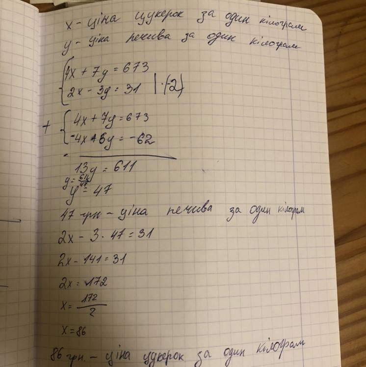 Розв'язати задачу за допомогою системи рівнянь. За 4 кг цукерок і 7 кг печива заплатили 673 гривні. Скільки коштує 1 кг цукерок і 1 кг печива, якщо 2 кг цукерок дорожчі за 3 кг печива на 31 гривню?