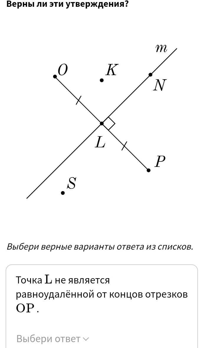 Точка L не является равноудалённой от концов отрезков OP. Расстояния от точки K до точек O и P равны. Точка N равноудалена от концов отрезка OP. Расстояния от точки S до точек L и P равны