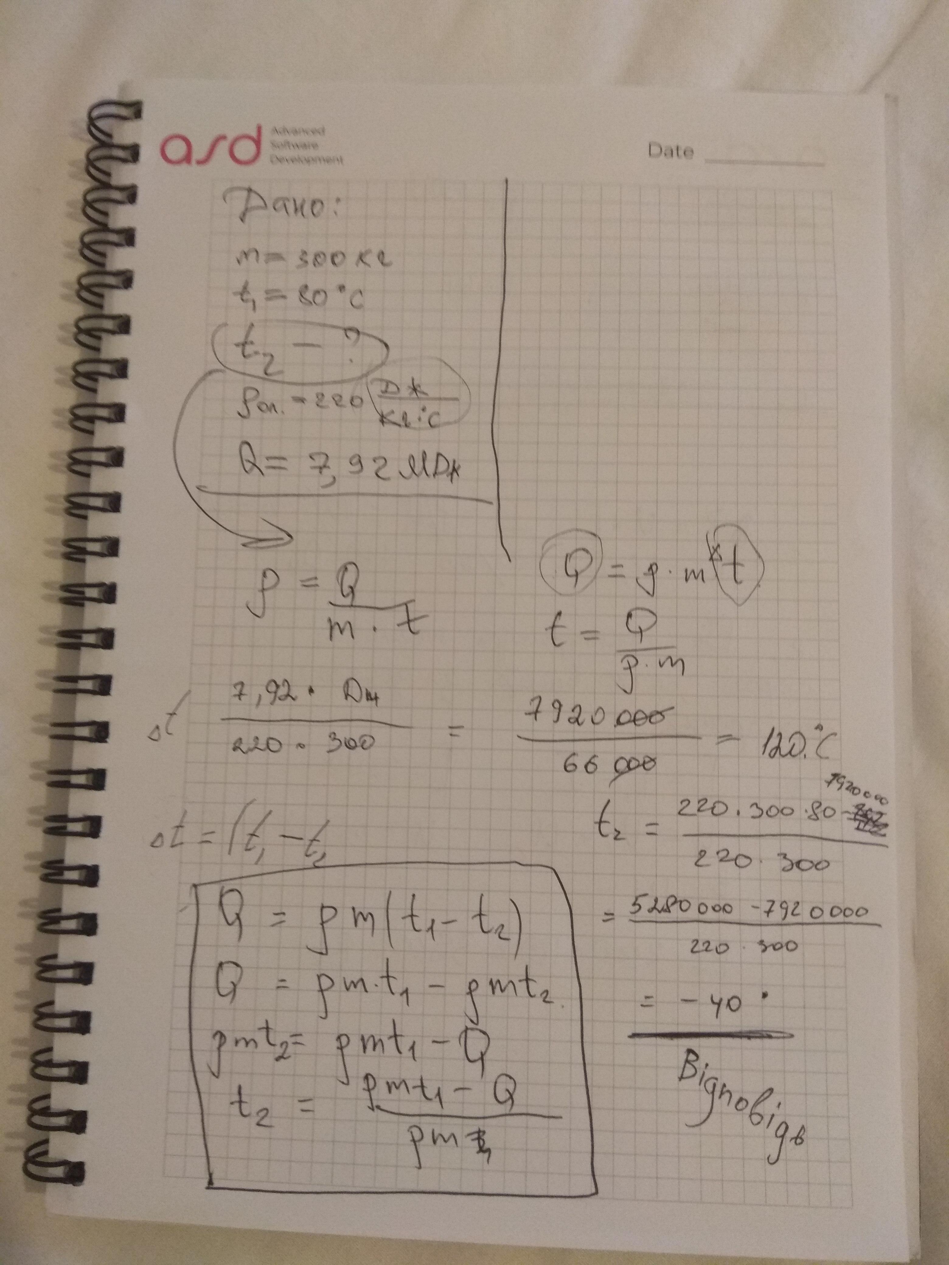Кусок олова массой 300 кг начал остывать при 80°С. Какова была конечная температура олова, когда при охлаждении выделилось 7,92 МДж энергии? Удельная теплоемкость олова 220 Дж/(кг×°С).