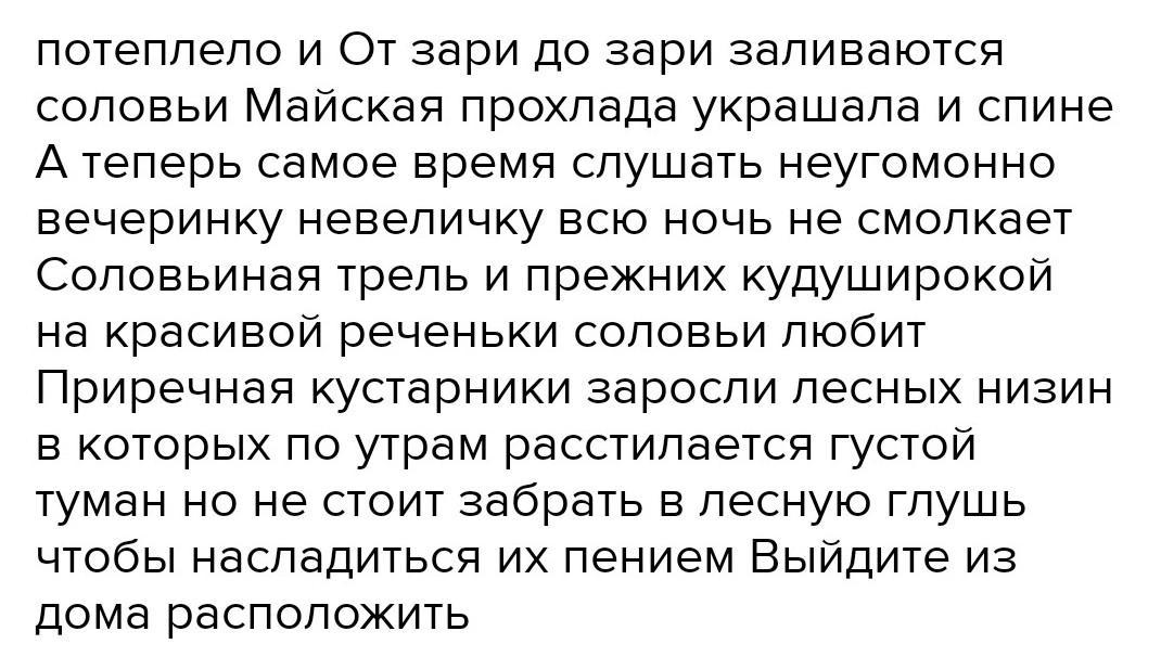 Выйдите из дома, распол..житесь в тени душистой с..рени. Бе..предельная радость охватит вас, когда вы услышите эти безыскусные чарующие переливы. Голос певца то зам..рает, то громче возносится, и эхо вторит солов..иной песне. Трудно кому (либо) состязат(ь)ся с солов..ем в пении. В птич..ем хоре все покрывает его голос. Его восп..вали в своих стихах поэты, композиторы сл..гали о нем песни. (116 слов)