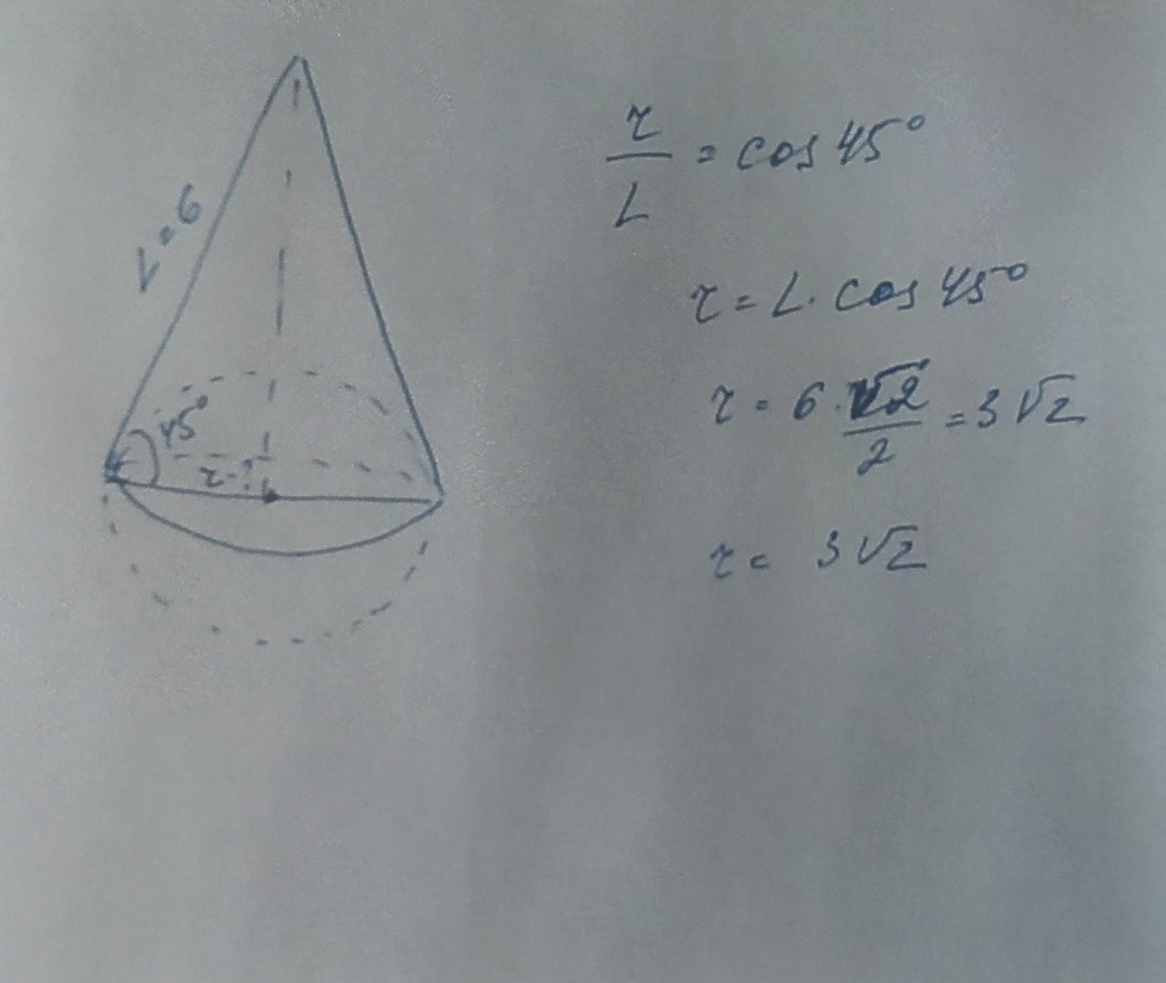 Образующая конуса равна 6см, угол наклона образующей к основанию равен 45°.Найдите радиус шара, вписанного в конус .