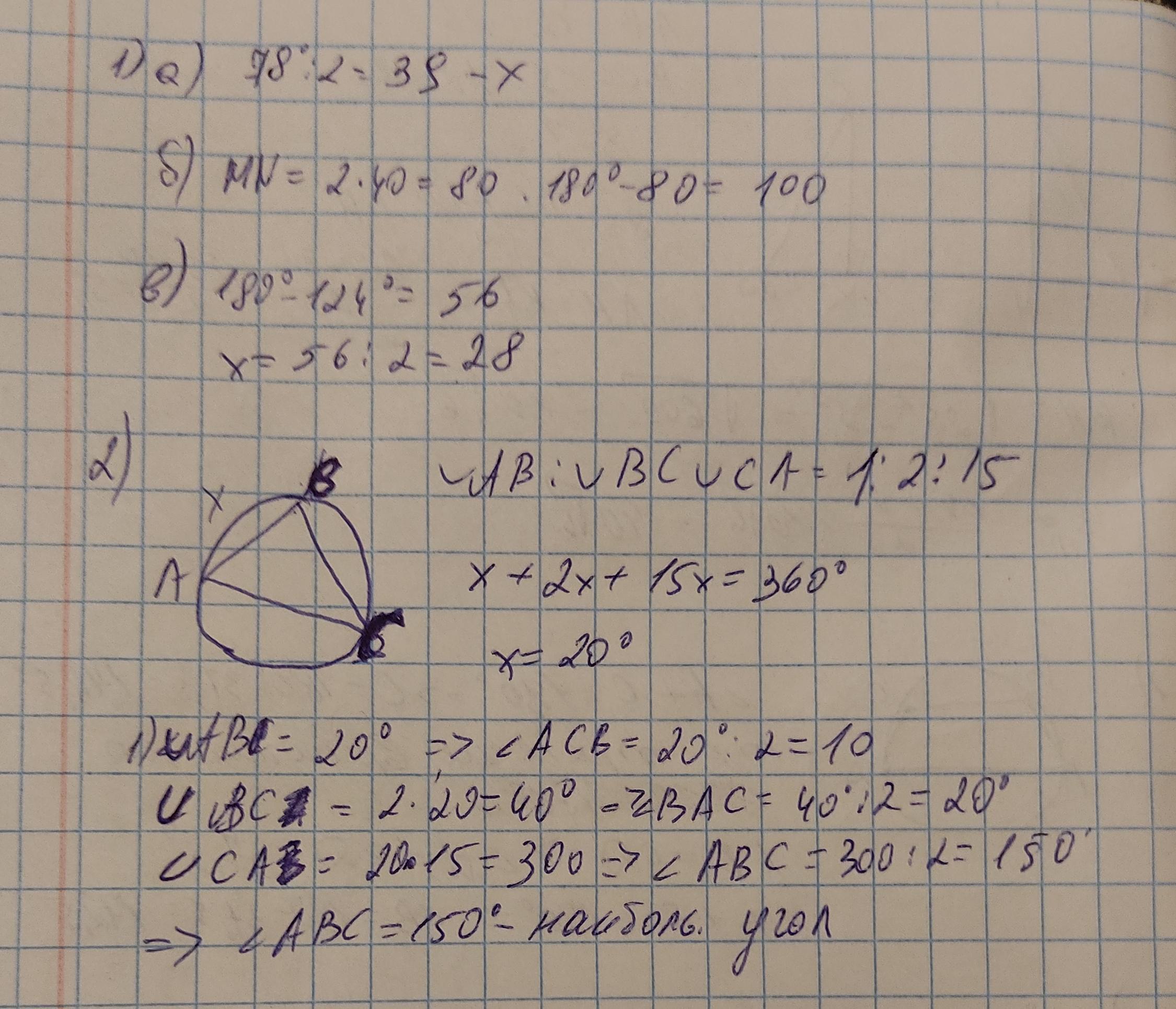 2. Точки А, В и С, расположенные на окружности, делят её на три дуги, градусные величины которых относятся как 1:2:15. Найдите больший угол Δ АВС.