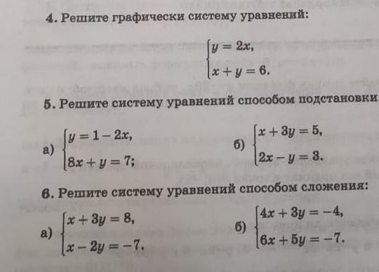 Решите пж очень срочно пж решите 5,6,7.пж даю 50 баллов срочно !!! 4. Решите графически систему уравнений: y = 2x, [x+y= 6. 5. Решите систему уравнений способом подстановки: y=1- 2х, х+ Зу = 5, a) 6) |8х + y = 7; 2х - у = 3. 6. Решите систему уравнений способом сложения: х+ Зу = 8, 4х + Зу = -4, a) 6) [x-2y = -7. |6х + бу = -7. на фото все есть решите 5,6,7 пж срочно !!!