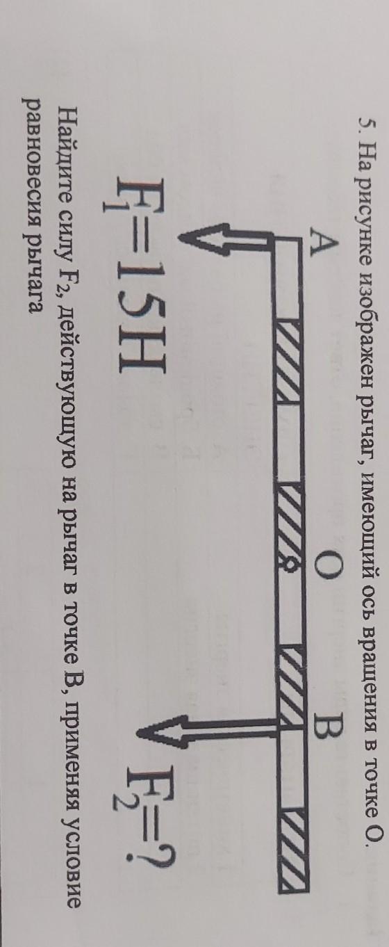 5. На рисунке изображен рычаг, имеющий ось вращения в точке О. F=15H F=? Найдите силу F2, действующую на рычаг в точке В, применяя условие равновесия рычага