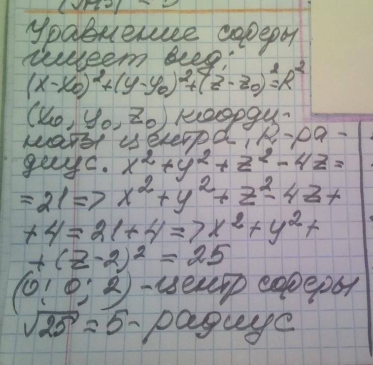 Найдите координаты центра и радиус сферы x2 + у2 + z2 - 4z = 21.​