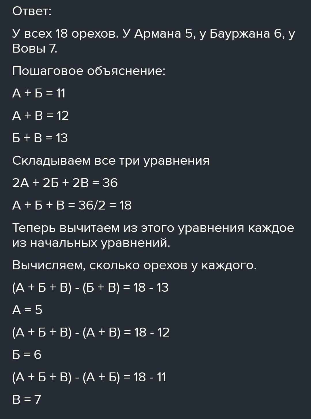 У Армана и Бауржана вместе 11 орехов, у Армана и Вовы – 12 орехов, у Бауржана и Вовы – 13 орехов. Сколько всего орехов у Армана, Бауржана, Вовы вместе? плиз помогите а