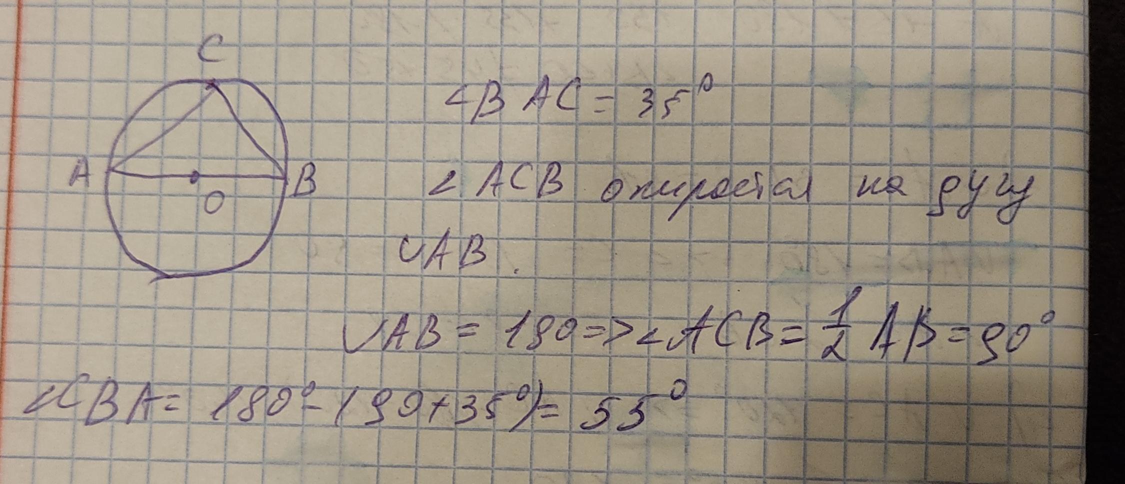 Дана окружность с центром в точке 0. AB -диаметр, точка С отмечена на окружности. угол BAC равен 35°. Найдите угол BCA и угол ABC.