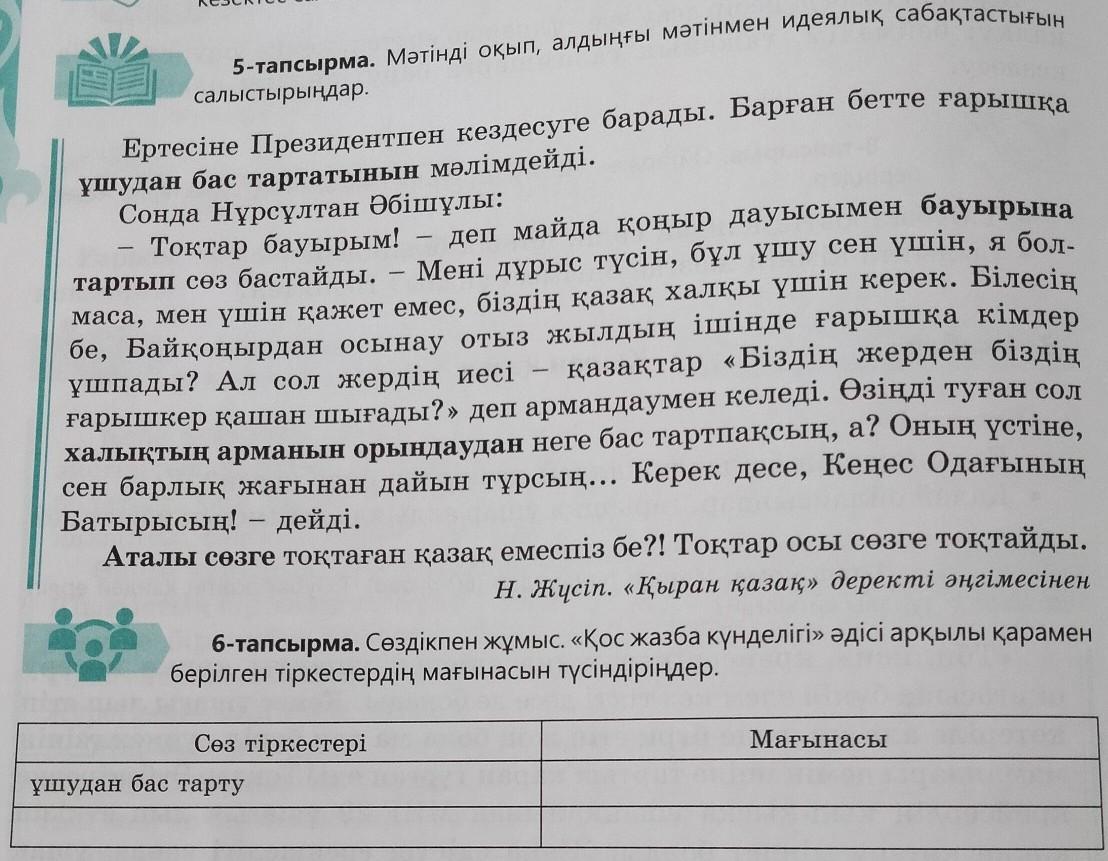6-тапсырма. Сөздікпен жұмыс. «Қос жазба күнделігі» әдісі арқылы қарамен берілген тіркестердің мағынасын түсіндіріңдер. Мағынасы Сөз тіркестері ұшудан бас тарту