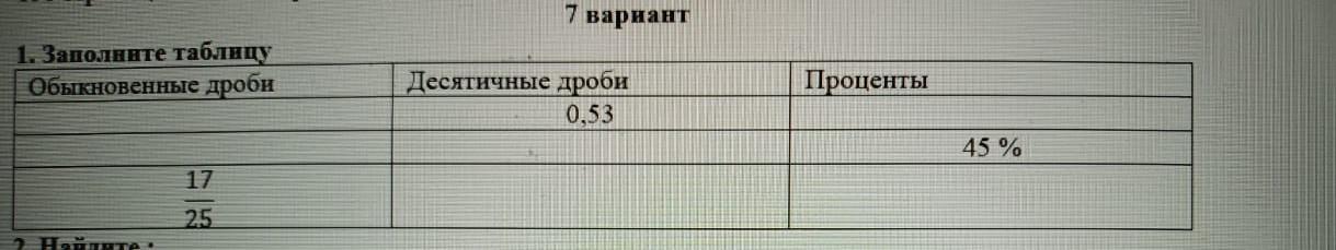 150 стр 7 вариант 1. Заполните таблицу Обыкновенные дроби Проценты Десятичные дроби 0,53 45 % 17 25