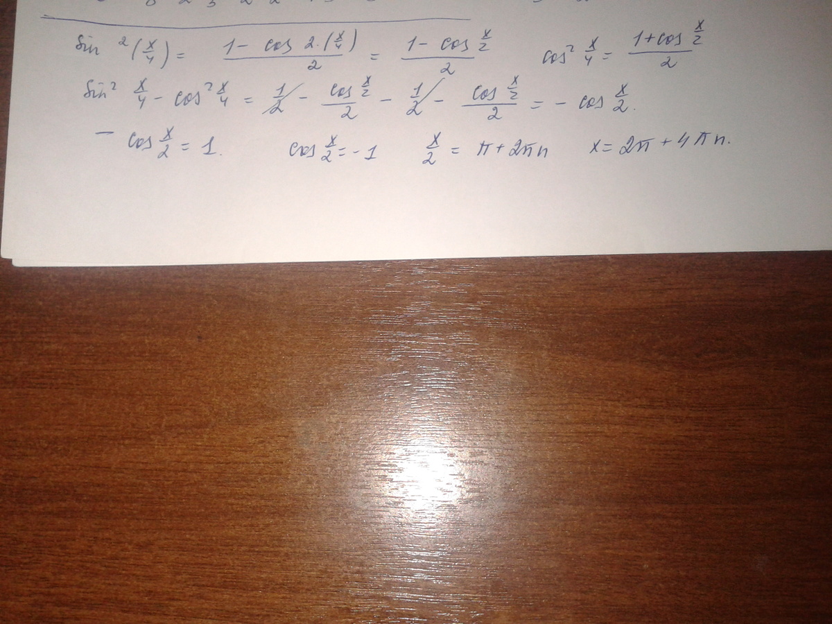 1-2cos^2(x/4)=1=>cos^2(x/4)=0=>1+cos(x/2)=0=>cos(x/2)=-1=>x=2pi+4pik