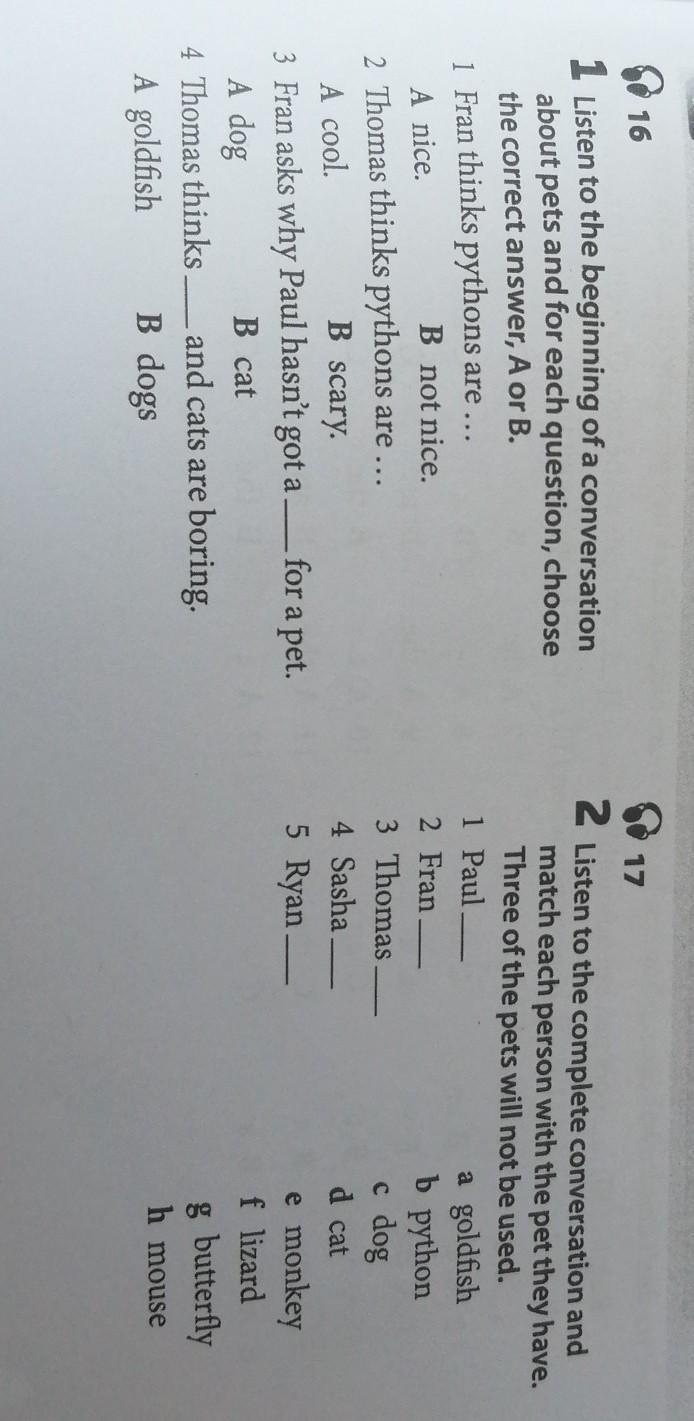 16 1 Listen to the beginning of a conversation about pets and for each question, choose the correct answer, A or B. 1 Fran thinks pythons are ... A nice. B not nice. 2 Thomas thinks pythons are ... A cool. 3 Fran asks why Paul hasn't got a — for a pet. A dog B cat 4 Thomas thinks — and cats are boring. A goldfish B dogs B scary. a