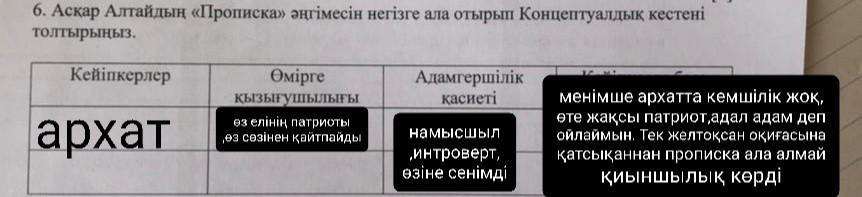 Асқар Алтайдың «Прописка» әңгімесін негізге ала отырып Концептуалдық кестені толтырыңыз. Кейіпкерлер -[2] Өмірге қызығушылығы Адамгершілік қасиеті Кейіпкерге баға