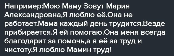 Ответ: Мою Маму Зовут Наталья Александровна ,Я люблю её. Она не работает .Мама каждый день трудится. Везде прибирается. Я ей помогаю. Она меня всегда благодарит за помочь, а я её за труд и чистоту. Я люблю Мамин труд!