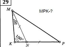 У ΔMNK ∠KNM = 180° - ( 20° + 100° ) = 60° .