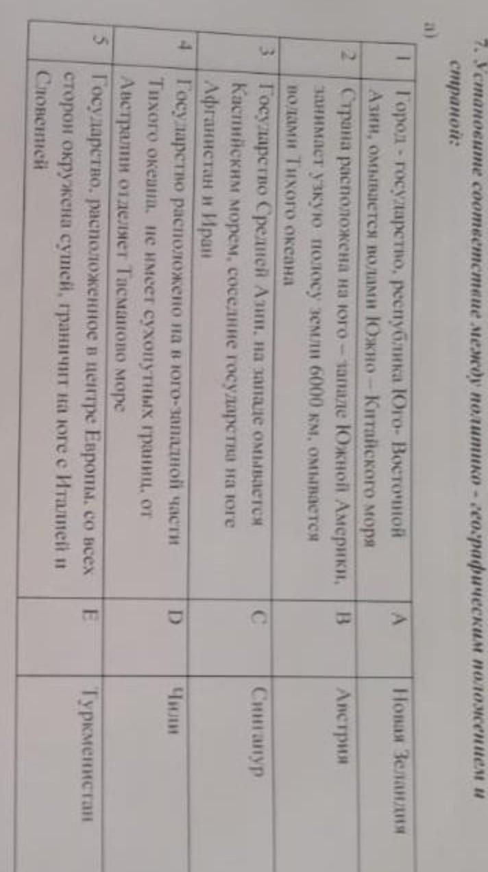 7. Установите соответствие между политико-географическим положением и страной: Новая Зеландия Австрия Сингапур 1 Город - государство, республика Юго-Восточной A Азии, омывается водами Южно-Китайского моря 2 Страна расположена на юго-западе Южной Америки, в занимает узкую полосу землн 6000 км, омывается волами Тихого океана 3 Государство Средней Азии, на западе омывается с Каспийским морем, соседние государства на iore Афганистан и Иран Государство расположено на в юго-западной части D Тихого океана, не имеет сухопутных границ. от Австралии отделяет Тасманово море 5 | Государство, расположенное в центре Европы. со всех E сторон окружена сушей, граничит на юге с Италией и Чили Туркменистан