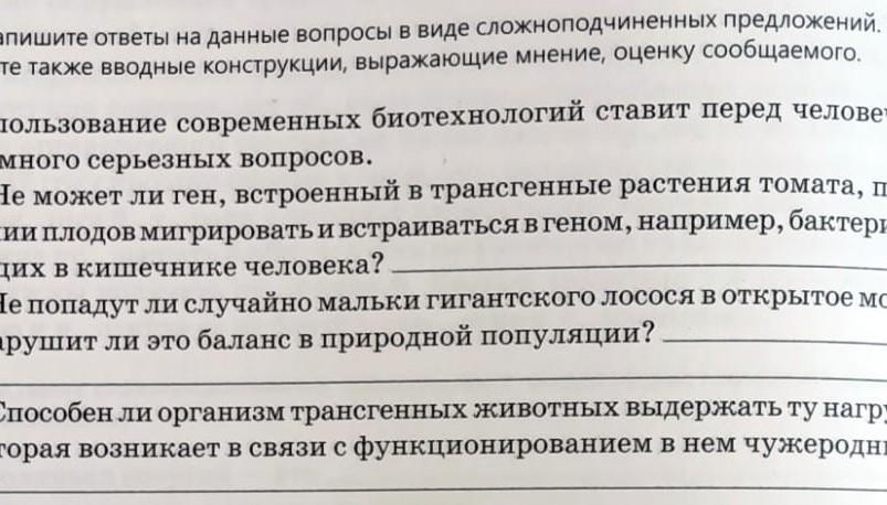 2. Запишите ответы на данные вопросы в виде сложноподчиненных предложений и пользуйте также вводные конструкции, выражающие мнение, оценку сообщаемого Использование современных биотехнологий ставит перед человече ством много серьезных вопросов. Не может ли ген, встроенный в трансгенные растения томата, при съедании плодов мигрировать и встраиваться в геном, например, бактерий, живущих в кишечнике человека? Не попадут ли случайно мальки гигантского лосося в открытое море и не нарушит ли это баланс в природной популяции? Способен ли организм трансгенных животных выдержать ту нагруа- ку, которая возникает в связи с функционированием в нем чужеродных генов?