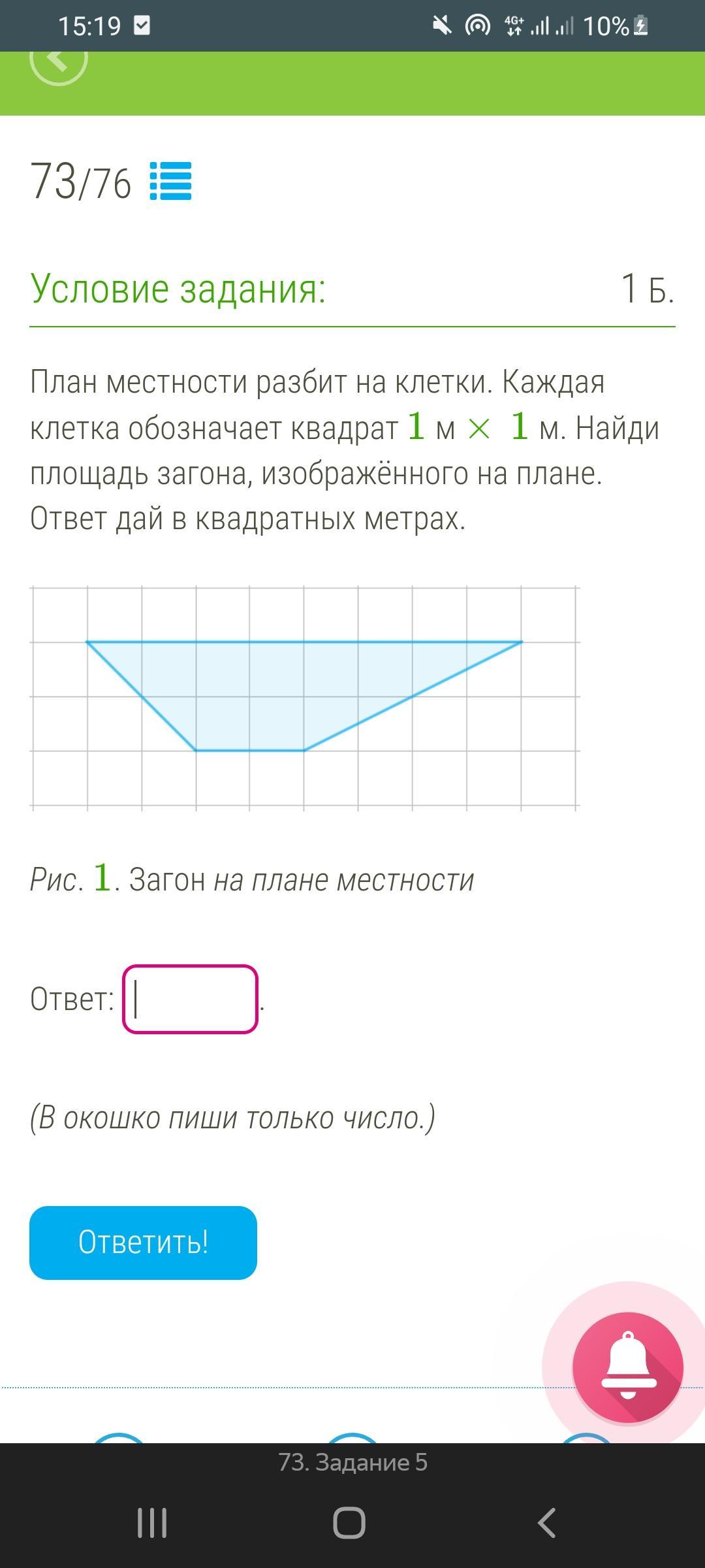 План местности разбит на клетки. Каждая клетка обозначает квадрат 1 м × 1 м. Найди площадь загона, изображённого на плане. Ответ дай в квадратных метрах.