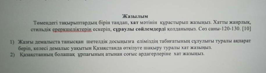 Сәлем Ләйлә! Мен бүгін саған хат жазып отырмын, хатымды бастамас бұрын жағдайынды сұрап алайын. Жалпы жағдайын қалай?... меніңде жағдайым жақсы. жазғы демалыста Қазақстанға келсеңші екеуміз Алматының ғажайып жерлеріне бірге барайық, алматыда өте көп ойын сауық жерлері бар ғой солайша жазғы демалысымызды қызықты әрі тамаша өткізейік.