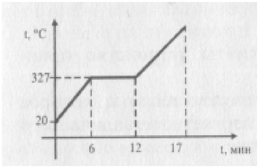 1)На рисунке показан график изменения температуры свинца с течением времени. Определите в какой момент времени и при какой температуре начался процесс плавления? Сколько минут он длился?
