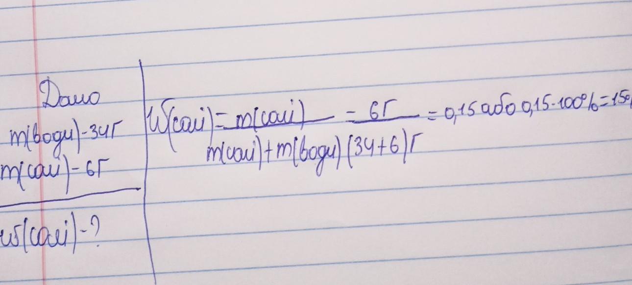Срочно!!! 6 г солі розчинили в 34 г води. Яка масова частка солі в розчині який утворився . Розпишіть все з Дано і тд пж