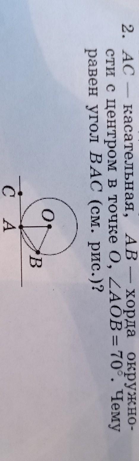 2. Ас касательная, AB — хорда окружно- сти с центром в точке 0, AOB = 70°. Чему равен угол ВАС (см. рис)