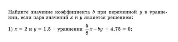 Найдите значение коэффициента в при переменной у в уравне нии, если пара значений х н н является решением: 1) х - 2 ир - 1,5 - уравнения 5 8 x-by +4.75 - 0:
