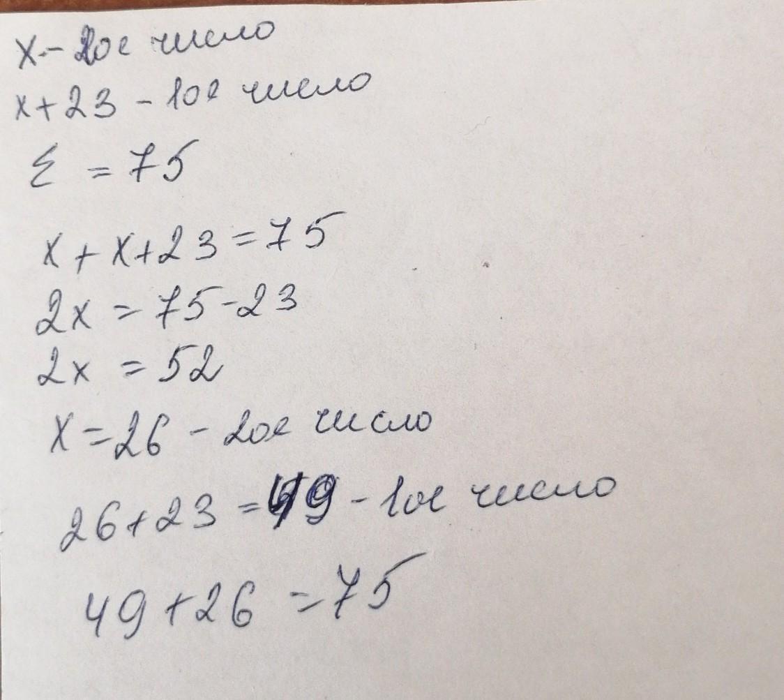 ОЧЕНЬ СРОАНО ПЖЖЖАЛЫДВ сумма двух чисел рауна 75. первое чтслона 23 больше второго. найдите эти числа