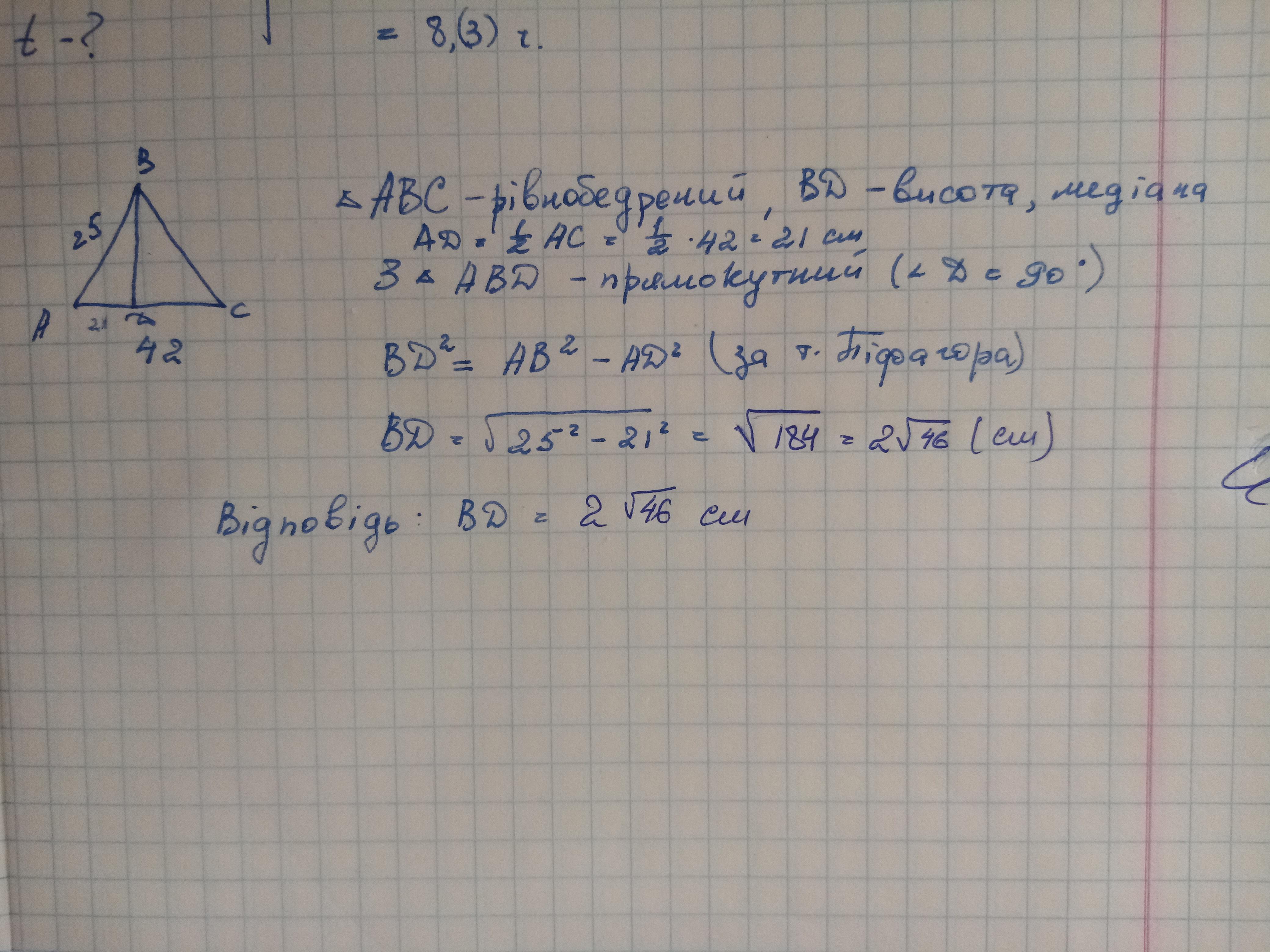 Знайдіть висоту рівнобедреного трикутника, проведеної до основи, якщо бічна сторона 25 см, а основа - 42см.