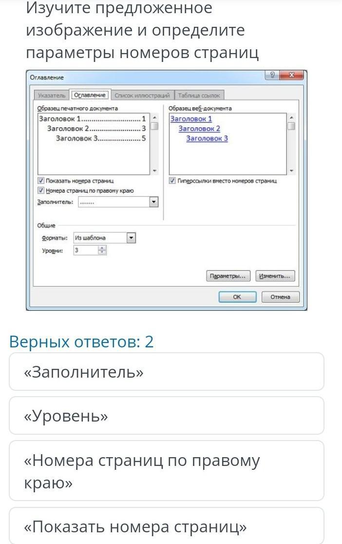 Изучите предложенное изображение и определите параметры номеров страниц Оглавление 9 х Указатель Оглавление Список иллюстраций Таблица ссылок Образец печатного документа Заголовок 1........ Заголовок 2.... Заголовок 3.... Образец веб-документа Заголовок 1 Заголовок 2 Заголовок 3 .5 Египерссылки вместо номеров страниц Показать номера страниц Номера страниц по правону краю Заполнитель: Общие Форматы: Из шаблона Уровни: 3 Параметры... Изменить... ок Отмена Верных ответов: 2 «Заполнитель» «Уровень» «Номера страниц по правому краю» «Показать номера страниц» помогите пж