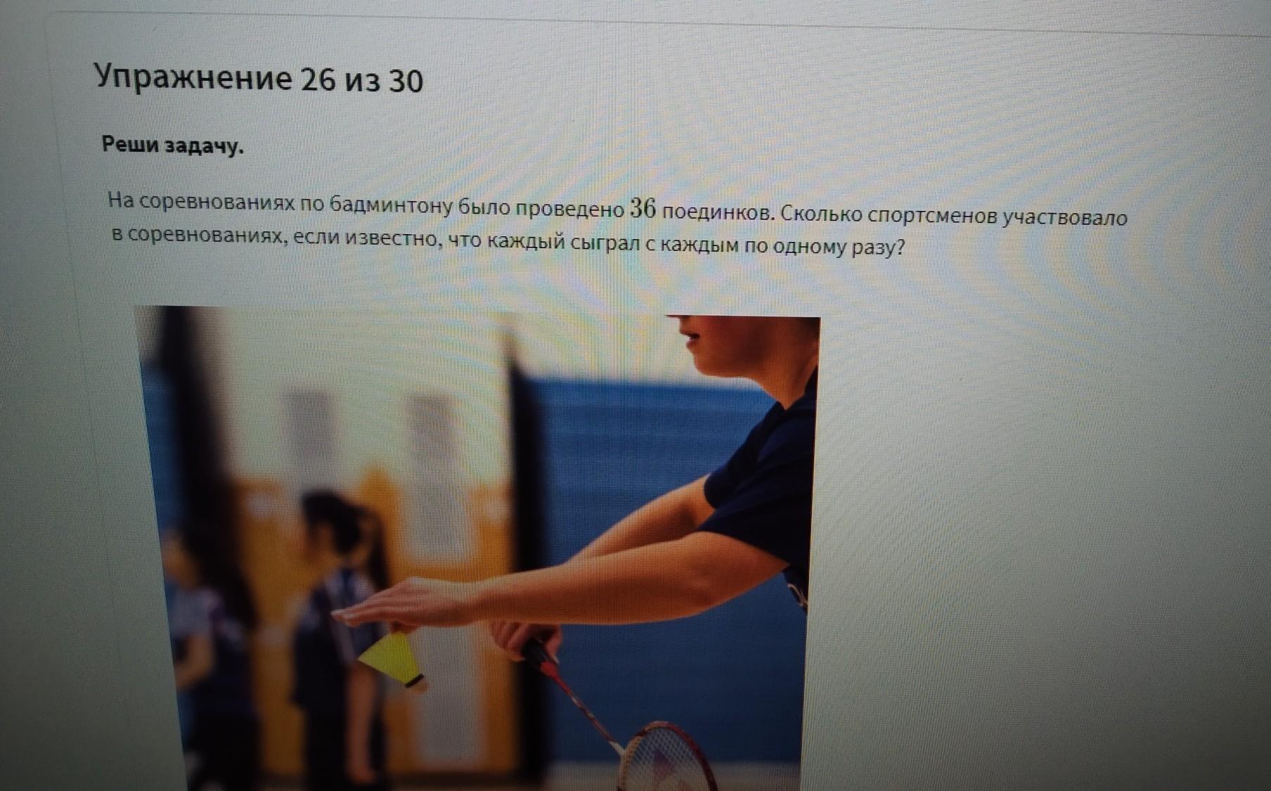 Упражнение 26 из 30 Реши задачу. На соревнованиях по бадминтону было проведено 36 поединков. Сколько спортсменов участвовало В соревнованиях, если известно, что каждый сыграл с каждым по одному разу?
